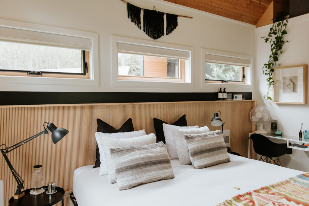 Our modern, Scandinavian-inspired deluxe cottages were designed with simplistic coziness in mind. Comfy beds, soft linens, fluffy pillows and a reading window seat offer perfect places to snuggle up to a loved one, or with a good book. Wake up and take a morning shower in the gorgeous bathroom, or take it outside in the steamy, outdoor shower adjoining the bathroom. A covered porch lined with warm cedar perches you with a perfect view of the property’s centerpiece, our magnificent maple and alder trees.
